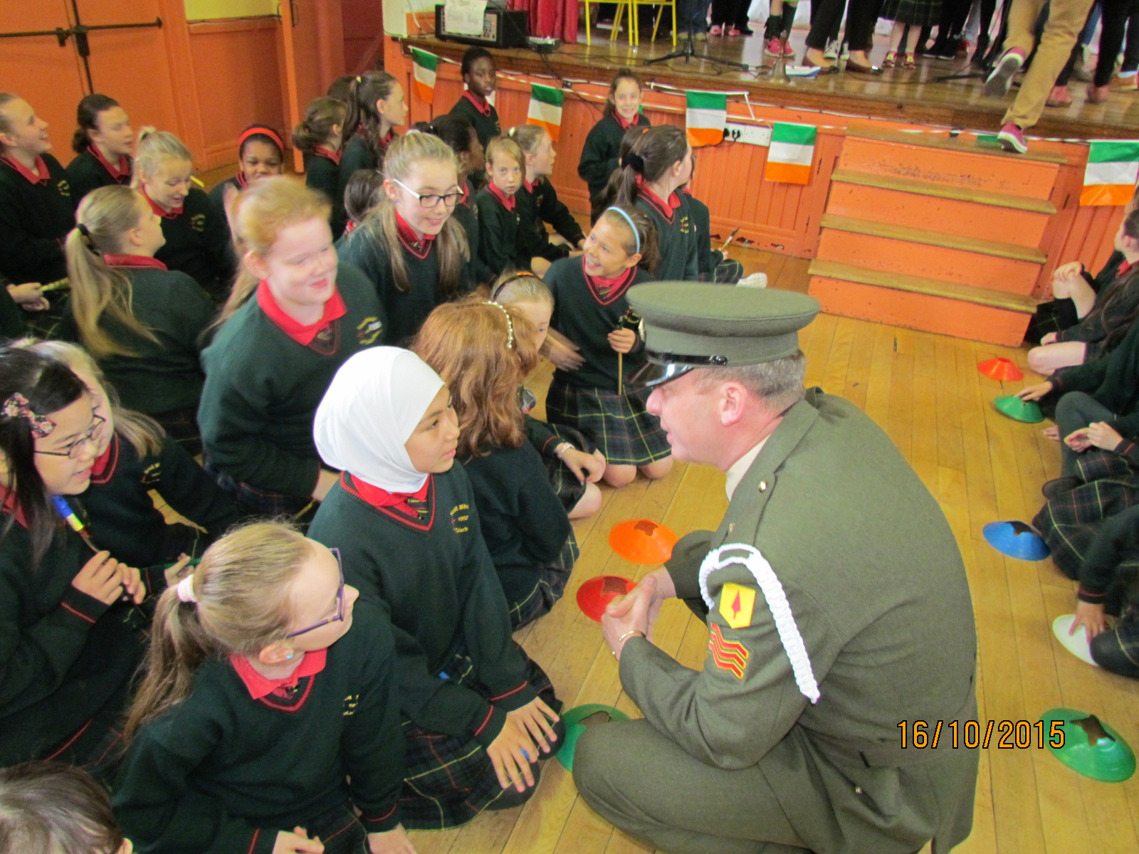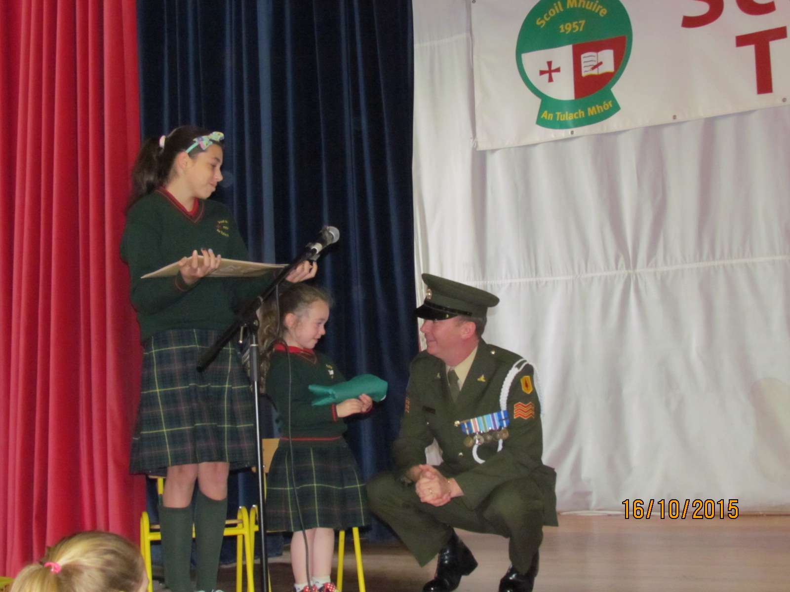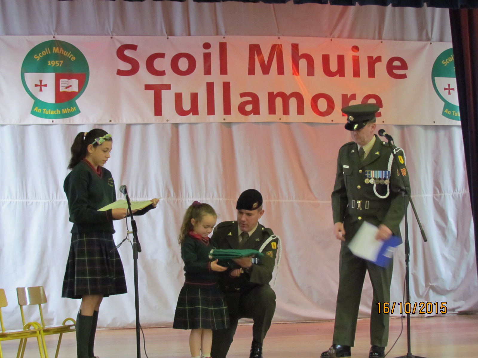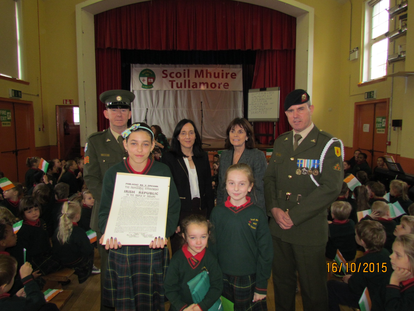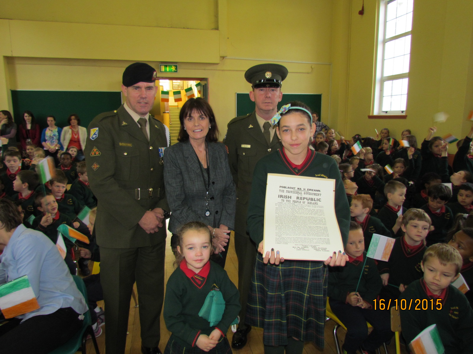 It was a very exciting day here at Scoil Mhuire as Sgt Quinn and Gunner Scally presented a copy of the 1916 Proclamation and our National Flag to Scoil Mhuire. The Defence Forces were warmly welcomed by Principal Ms. Doheny on arrival. The children waved their flags and sang Amhráin na bhFiann in full voice. Some students also gave a lovely rendition of our national anthem on tin whistle. It is a day we will never forget.
