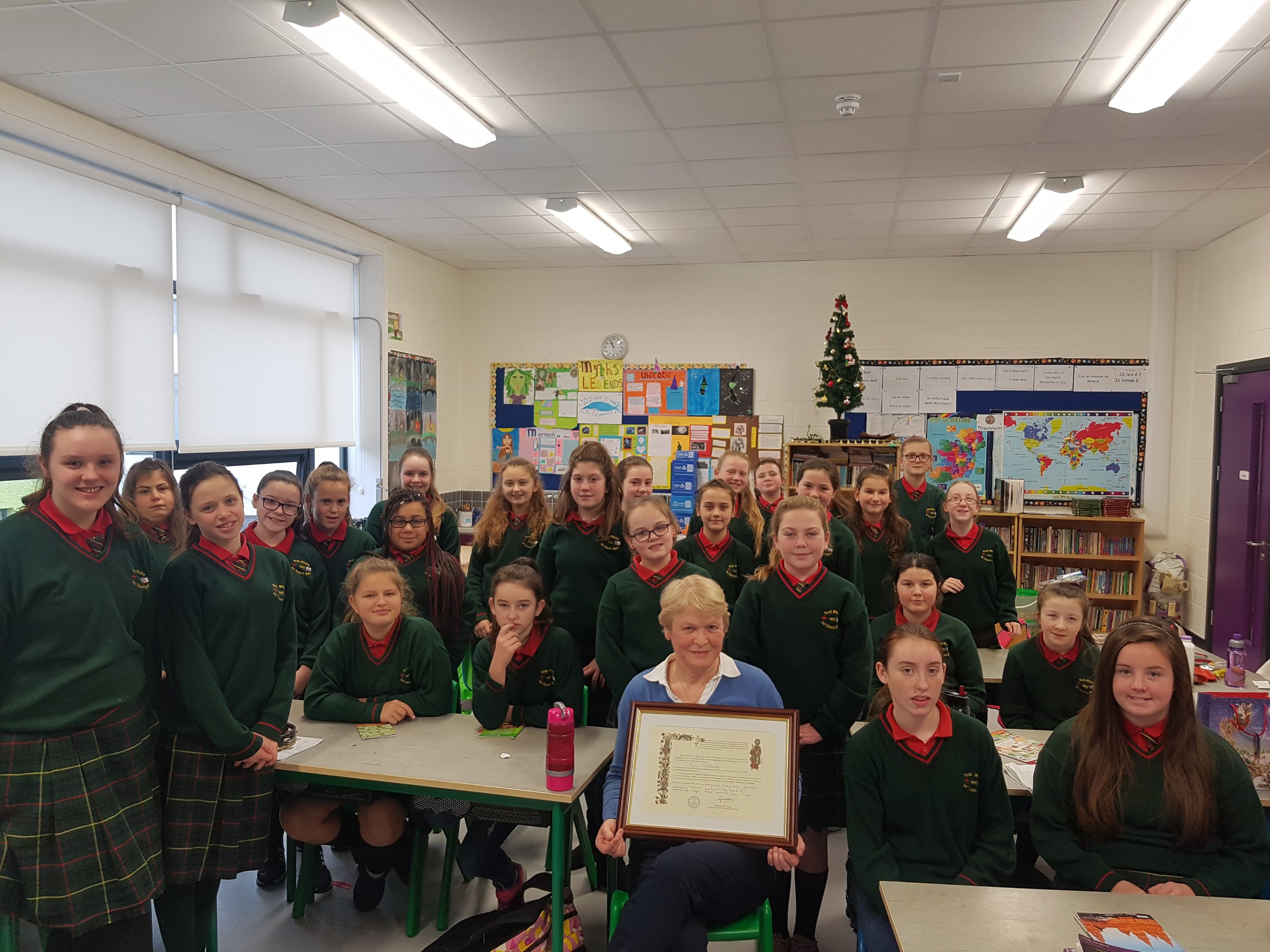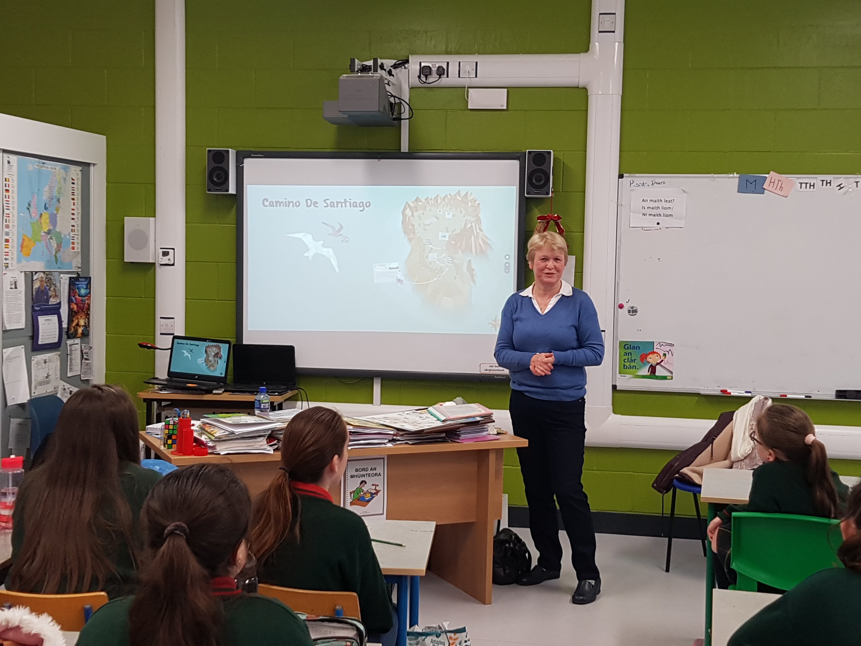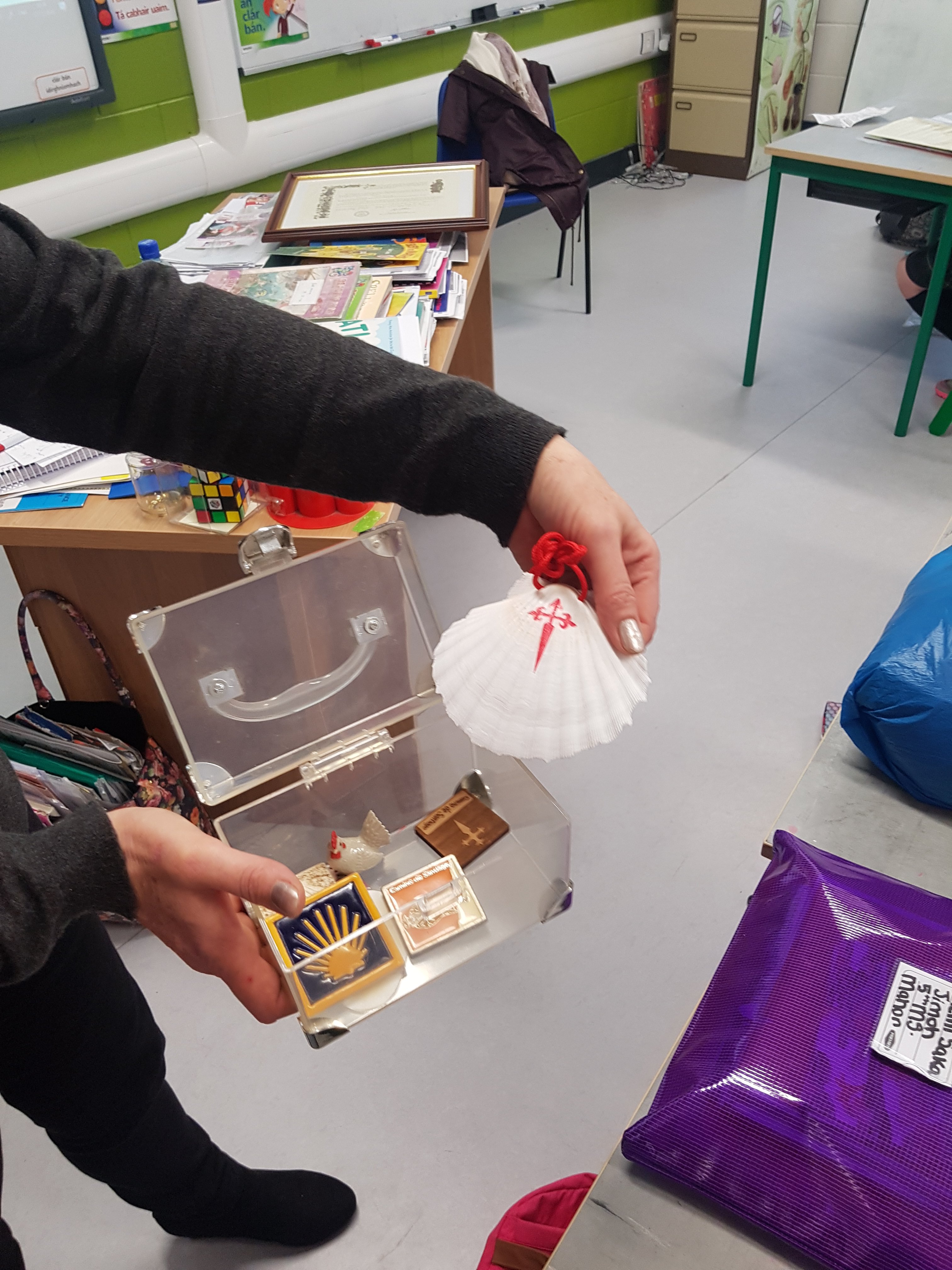 Today the confirmation students were treated to a wonderful talk on the Camino de Santiago by our former principal Máire McRedmond. Ms. McRedmond brought in lots of treasures from her four arduous,yet rewarding treks along the Camino Way. These included her special Camino passport and certificate of completion of the 500 mile walk. Did you know that St. James’ Gate in Dublin is in fact a stop along the Camino??!! Absolutely fascinating. We cannot thank Ms. McRedmond enough for sharing her stories, photos and first hand knowledge with us- the students greatly appreciated it.