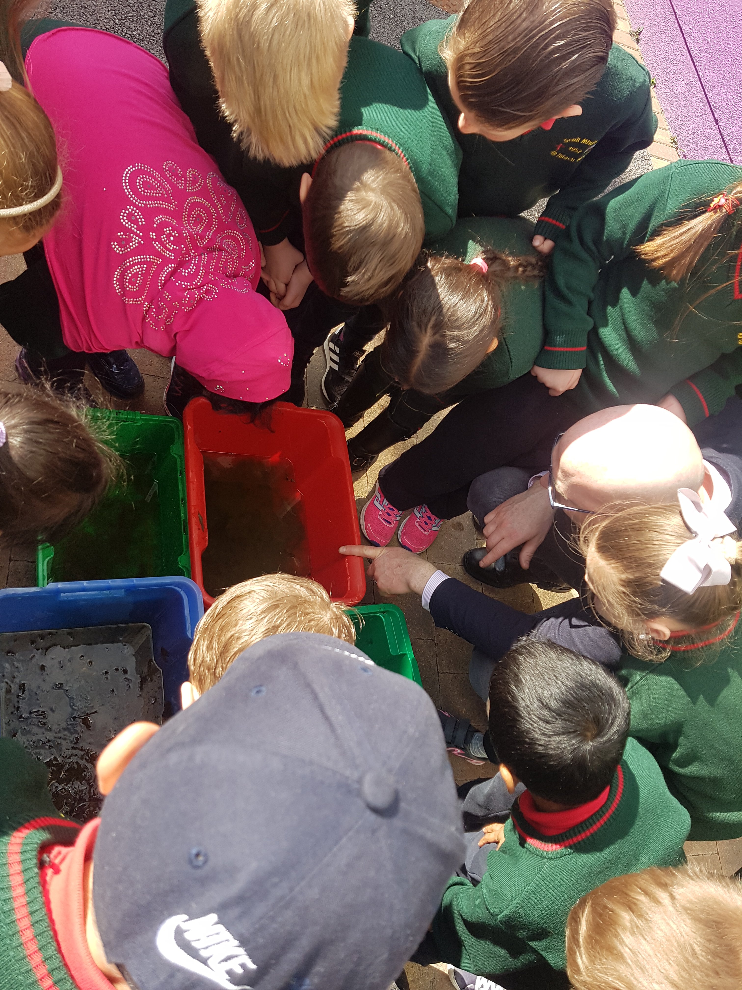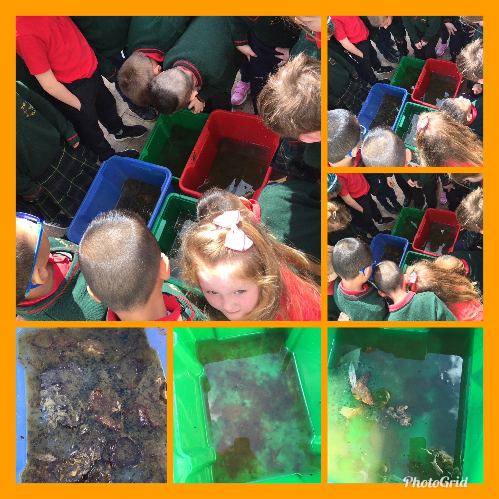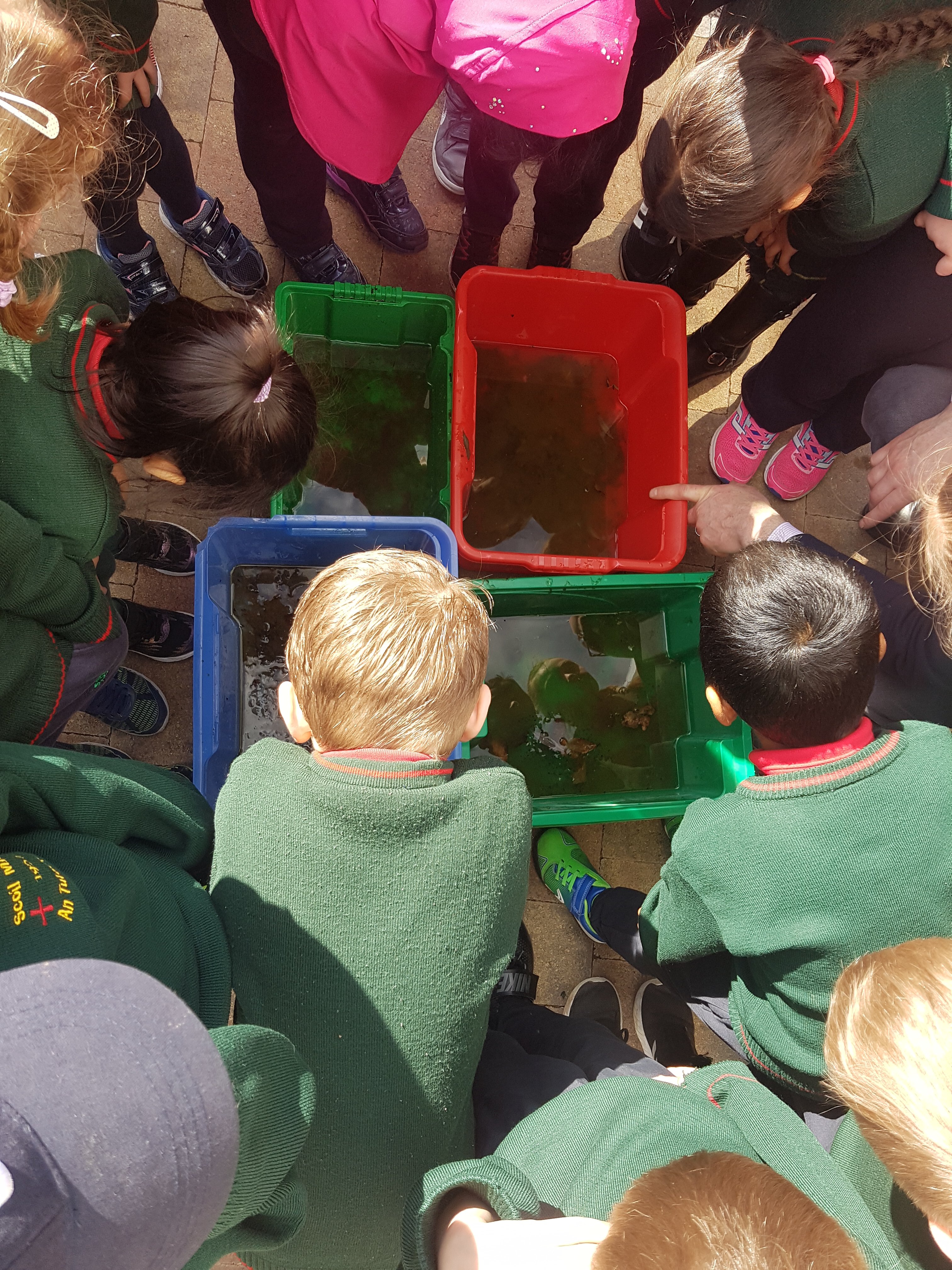 Heroes come in many different guises. This week it was the girls of Ms. Daly’s class who became super heroes. On one of their daily 10@10 trips to the park they noticed that there was some frog spawn in the fountain and monitored their progress every day since. It has been gloriously warm this week, much to our delight- however this meant trouble for the frog spawn as the fountain had dried up. It is not permitted to remove frog spawn except in serious life saving circumstance such as this and so the ladies of Ms. Daly’s responded quickly and rescued all the frog spawn. Every class was given a chance to inspect our new visitors, including some very lively tadpoles!!! Well done girls for saving the day!!!