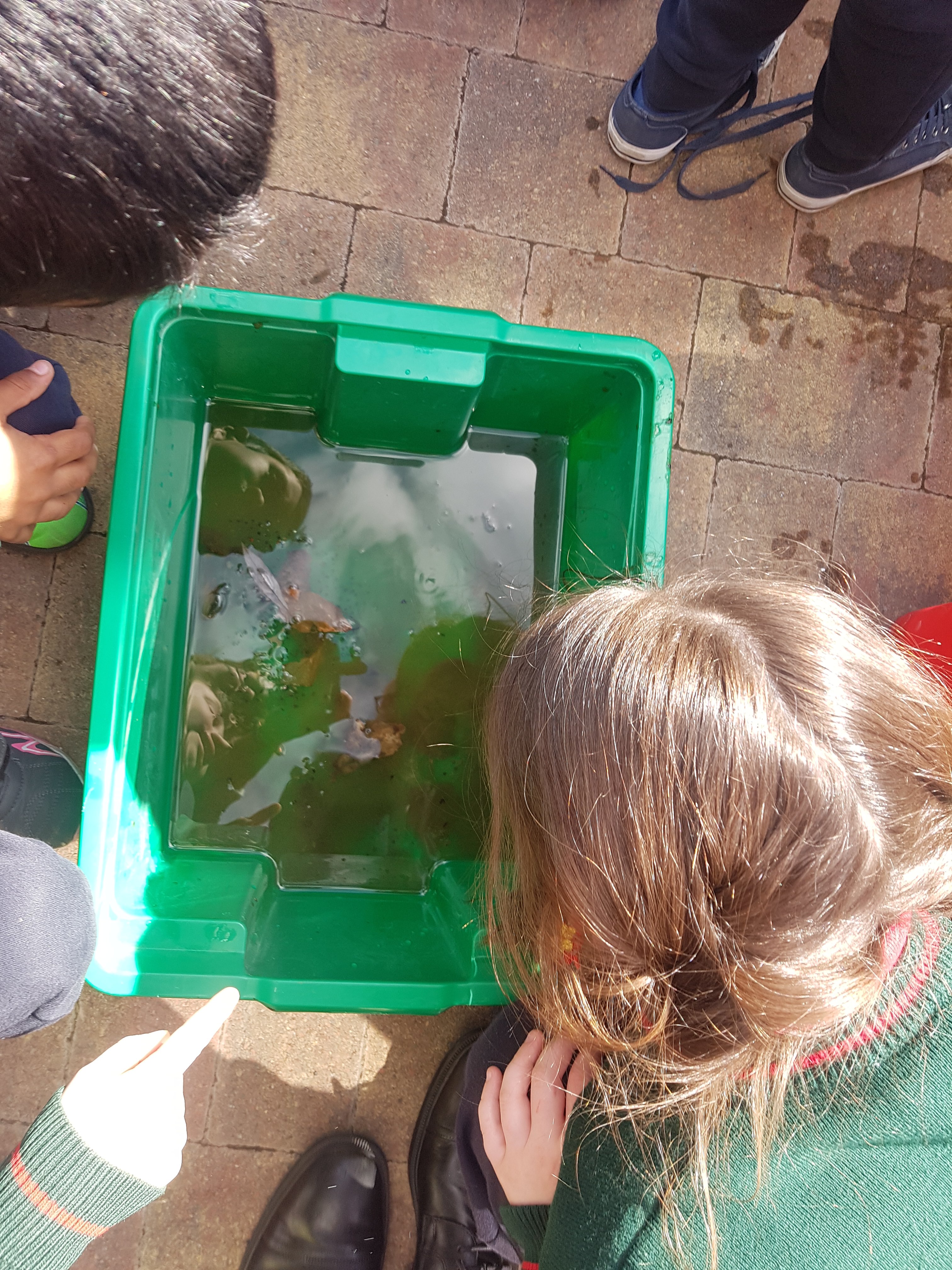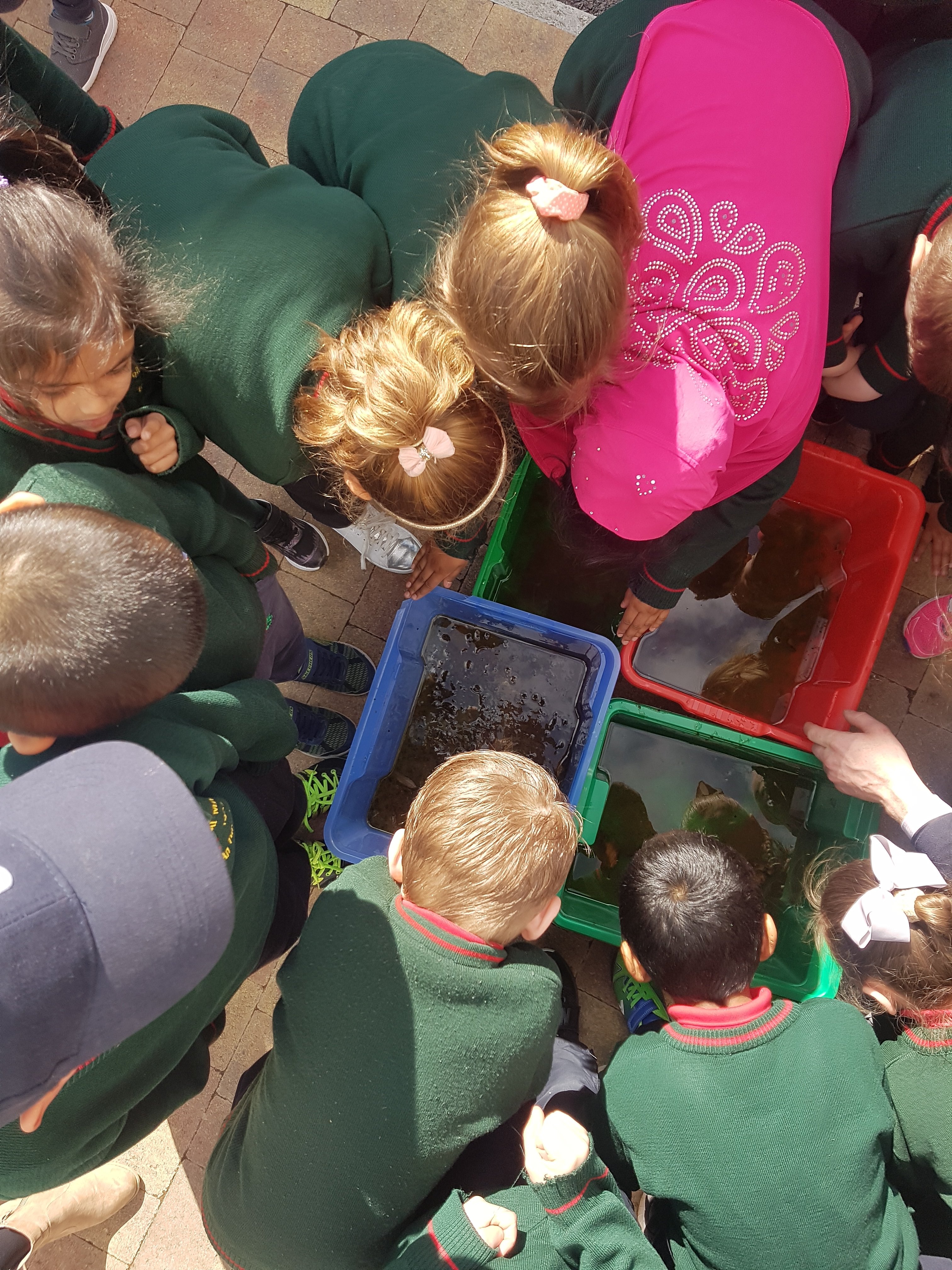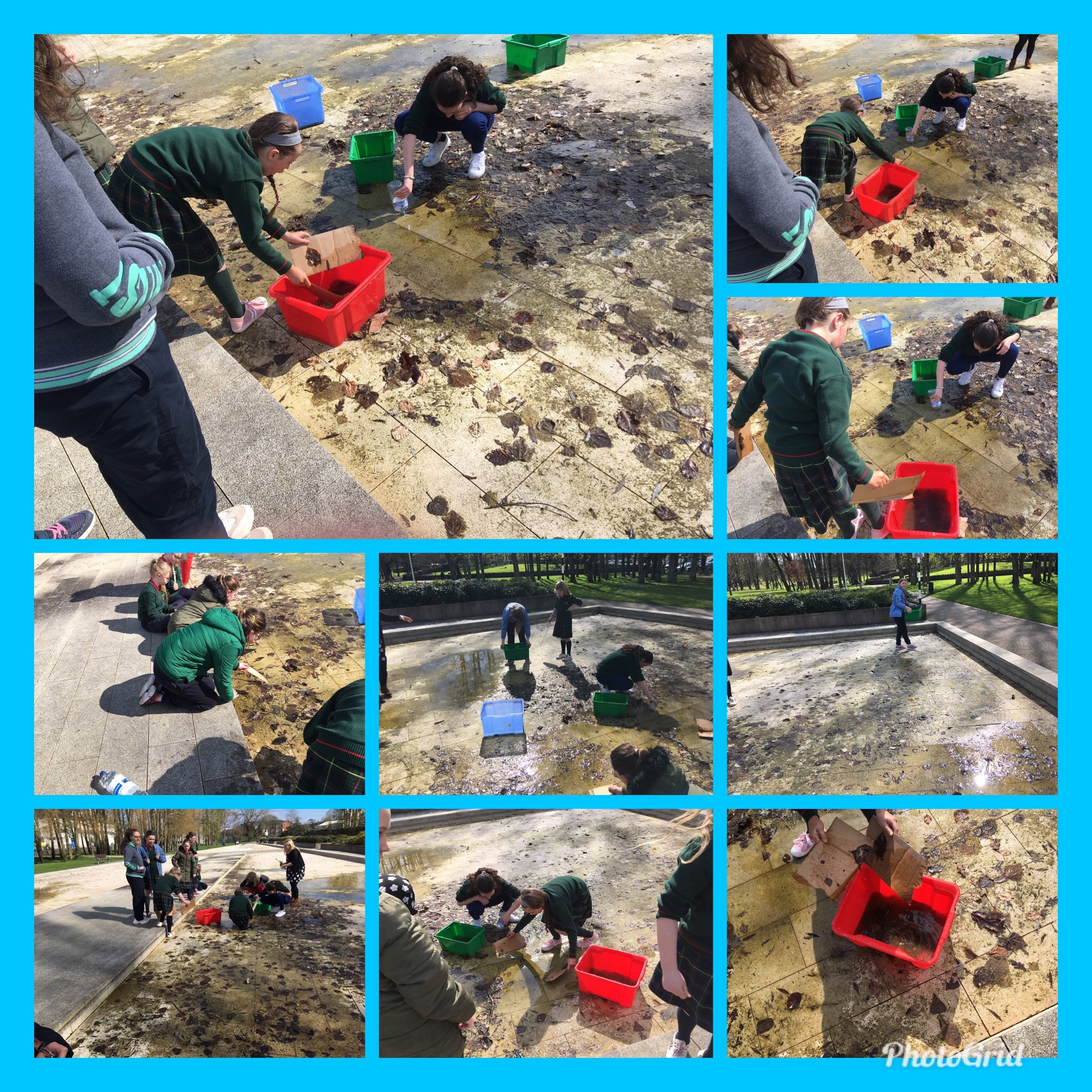 Heroes come in many different guises. This week it was the girls of Ms. Daly’s class who became super heroes. On one of their daily 10@10 trips to the park they noticed that there was some frog spawn in the fountain and monitored their progress every day since. It has been gloriously warm this week, much to our delight- however this meant trouble for the frog spawn as the fountain had dried up. It is not permitted to remove frog spawn except in serious life saving circumstance such as this and so the ladies of Ms. Daly’s responded quickly and rescued all the frog spawn. Every class was given a chance to inspect our new visitors, including some very lively tadpoles!!! Well done girls for saving the day!!!